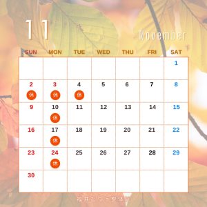 11月の営業日は下記のとおりです。 ※今月は臨時休業日が御座います。 11/2(日)〜4(火)の期間は福岡講演会のため臨時休業とさせて頂きます。 ...