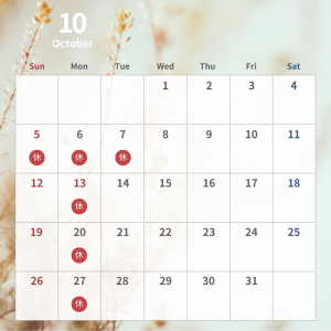※今月は臨時休業日が御座います。 10/5(日)〜7(水)の期間は弘前講演会のため臨時休業とさせて頂きます。
